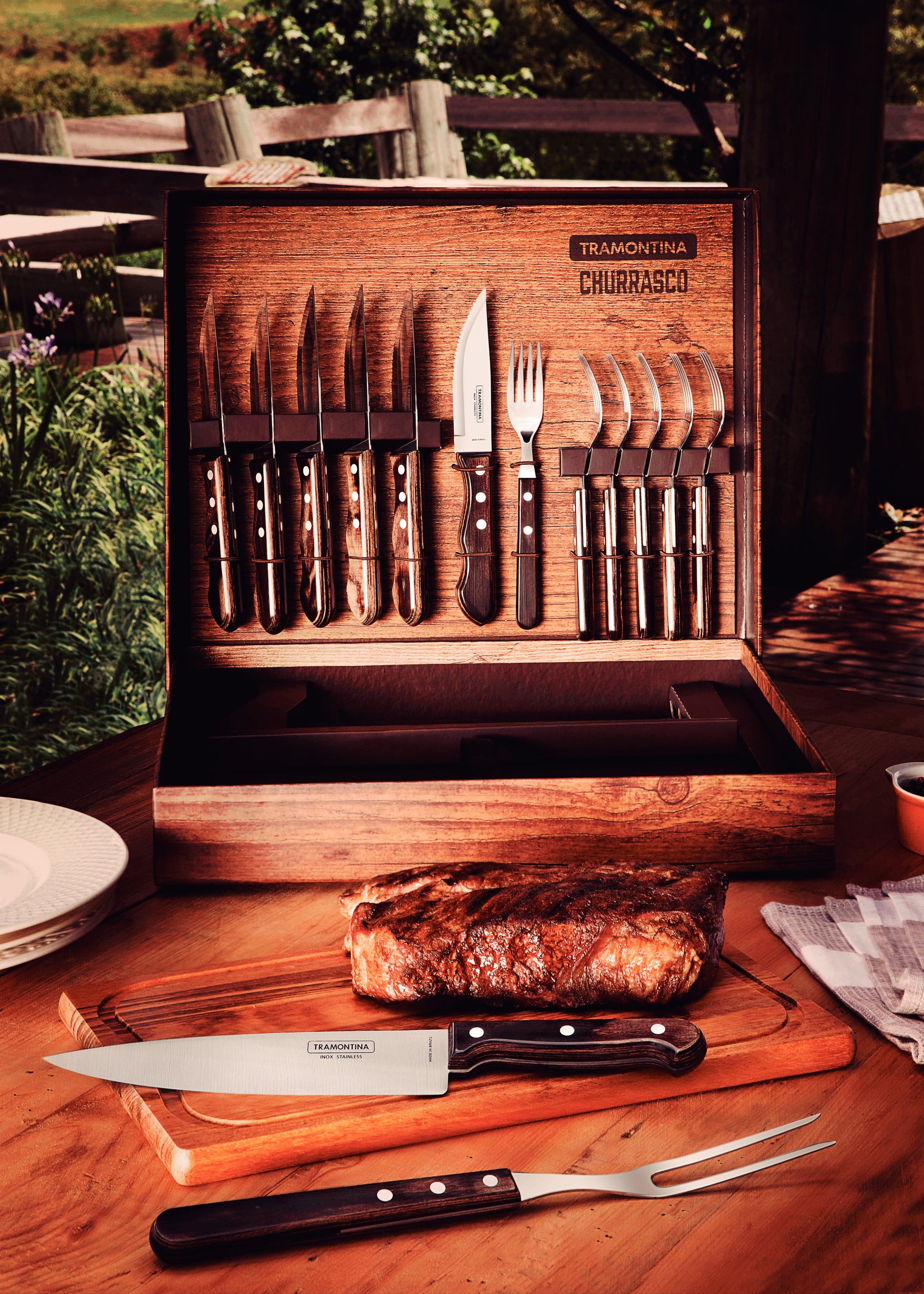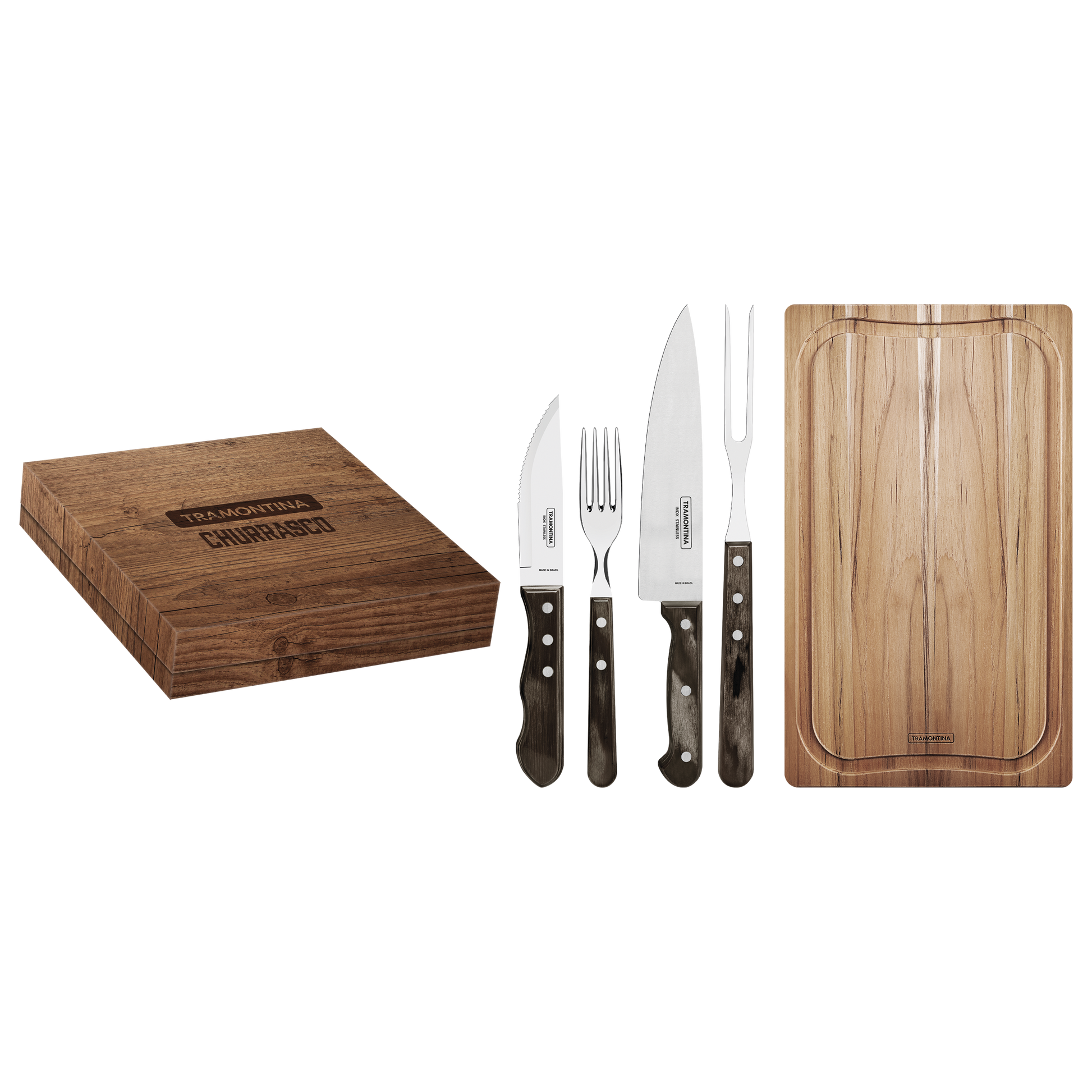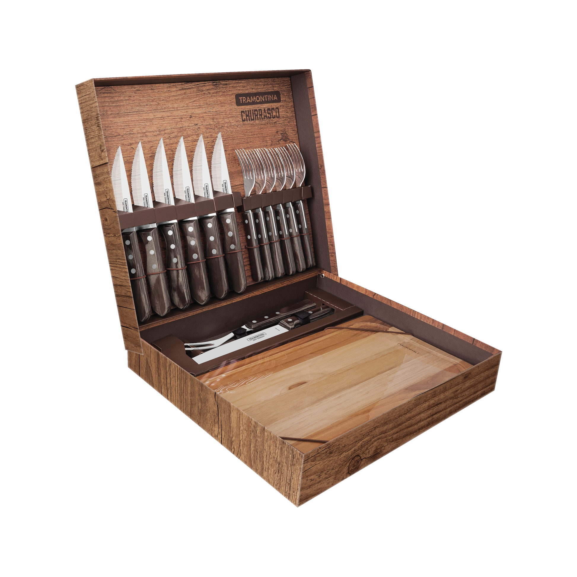 Este set de churrasco de 15 piezas Tramontina combina elegancia y funcionalidad, ideal para los amantes de la parrilla. Incluye cuchillos jumbo con mangos Polywood, tenedores, un cuchillo y tenedor parrillero, además de una tabla de corte, todo presentado en un estuche sofisticado perfecto para regalar.